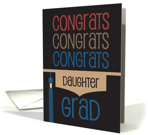 If your Daughter is graduating this year, whether from High School, College or even Junior High, celebrate the event by giving her this unique and dynamic stunning graduation card. The word "Congrats" on the card is repeated down the front, in colors of pink, gold and blue, with the second word "Grad" appearing larger and in blue, at the bottom of the card. At the center, a flat-topped mortarboard hat of a golden color divides the card with its flat brim, with a dangling blue tassel along the card's left side. The inside wording of the card says "You've graduated! Congratulations!"