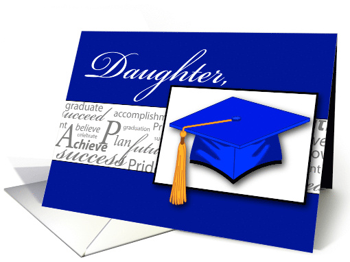 | Artist Notes: | Your Daughter has been a great student and now it's time to let her know how proud you are of her. A Graduation is a very important occasion. That’s why you need this elegant blue card for her Congratulations. A big blue graduation cap with a gold tassel and words about success will be meaningful to her. |