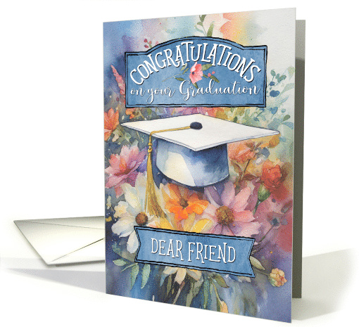 Colorful watercolor flowers surround a graduation cap with a gold tassel, wishing congratulations on graduation for a dear friend.