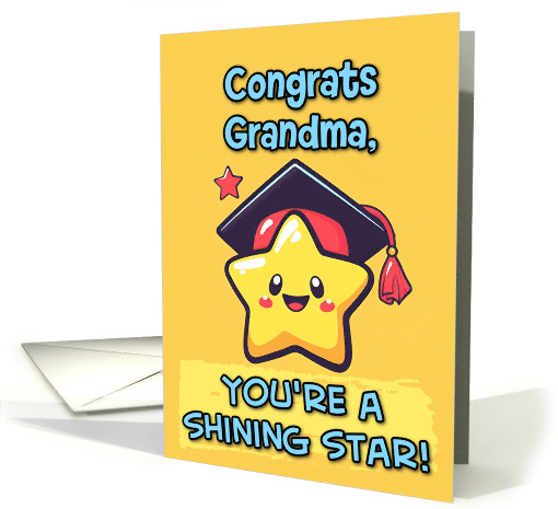 | Artist Notes: | A proud graduate kawaii cartoon star wearing a mortarboard on its head with a red tassle on a yellow background with the text "Congrats grandma, you're a shining star!" A fun card to send to that newly graduated grandma |