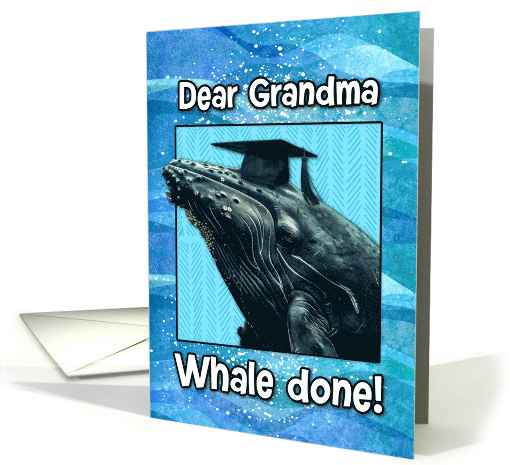 | Artist Notes: | A proud graduate whale wearing a mortarboard on its head with a tassle on a blue watercolor background with splatter effect and the text "dear grandma whale done!" A fun pun card to send to that newly graduated grandma |
