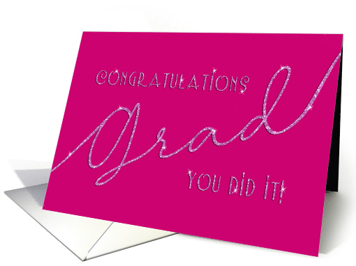 The pink glitter text on this congratulations greeting card for a graduate is not real, it just looks real! Additionally, the digital effects of twinkling stars help to make the pink lettering sparkle. Pink glitter look text which reads: 'Congratulations Grad, you did it!' is accented by the rich magenta color background, very suitable for females who are graduating either from high school or college or even baking school! You decide which occasion this is for and easily change the text inside or leave it as it is!