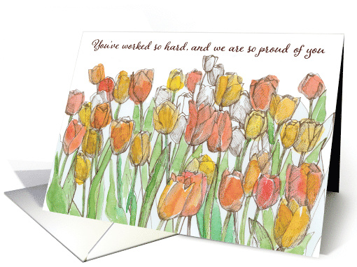| Artist Notes: | Graduation congratulations with, "you've worked so hard, and we're so proud of you" greetings decorated with cheerful tulip flowers in shades of orange, yellow, and salmon pink hand drawn with sepia ink and watercolor. |
