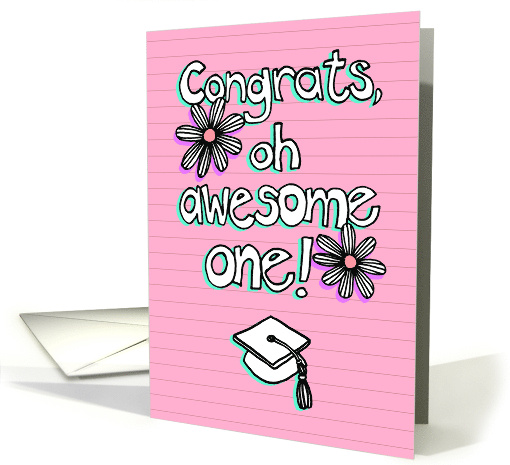 | Artist Notes: | Black and white hand lettered typography in a cute, modern, informal style reads: Congrats, oh awesome one! Simple cartoon drawings of a graduation cap and daisies complete this girly design, which is on a pink background with lines as if from an exercise book. Inside verse: Girl, you did it! (Of course, I always knew you would. But I still love it when you prove me right!) Congratulations on your graduation! |