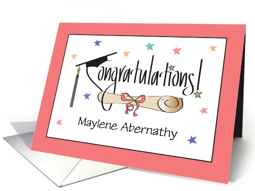"Congratulations!" is the large black hand lettered word that crosses the top of this pink bordered graduation card for a very special young lady or woman. A rolled parchment diploma is horizontally placed right below the word, with a black mortarboard hat covering the first letter of the word, "C", at an angle, with a tassel hanging downward. Stars of many bright colors surround the word. At the bottom of the card there is an area where you can type in the recipient's name, while ordering. This will make this a personalized card for her, with her name on the front. The inside wording of the card says "You've graduated! Congratulations and best wishes for a wonderful future, as you pursue your dreams!"