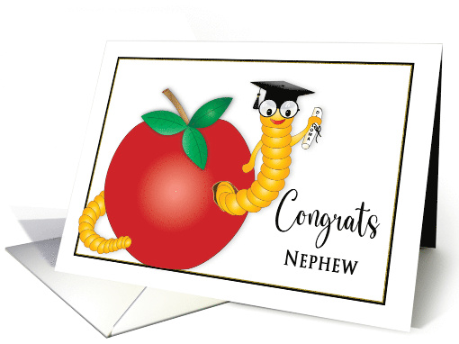 Fun congratulatory greeting for that special nephew who graduated from any type of school. This cute bookworm holds its diploma tight and is very proud to have graduated.