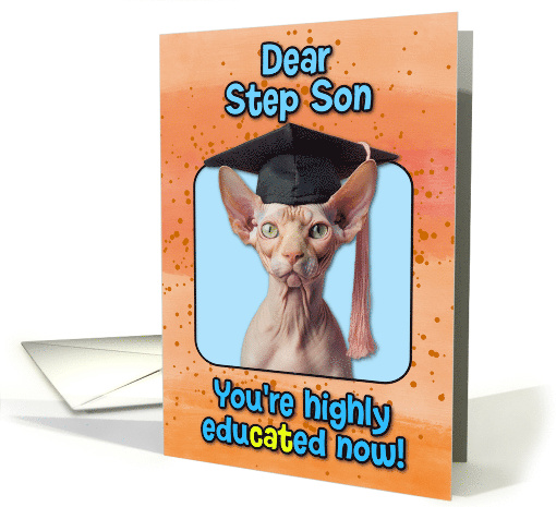 A proud graduate sphynx cat wearing a mortarboard on its head with a tassle on an orange and peach watercolor background with splatter effect and the text "dear step son you're highly educated now!" A fun pun card to send to that newly graduated step son