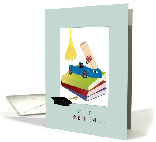 | Artist Notes: | Illustrated congratulations card for sports. A blue speedster car being driven. Number 8 sits on a stack of books. Diploma with a seal or ribbon stands up behind it. Cap with tassel next to books. Outside text: At the finish line . . . Inside text: . . . steer your way to celebrations. |