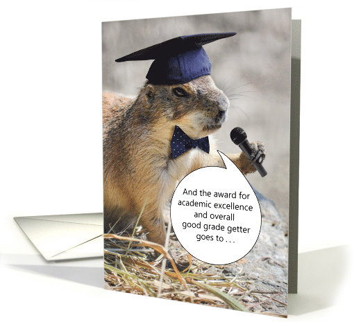 Artist Notes: Funny graduation congratulations for academic excellence and good grades. The graduate is awarded recognition because they decided to gopher their dreams. The award presenting gopher dons a graduation cap, bow tie and microphone.