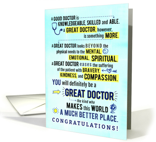 | Artist Notes: | Congratulate someone on their graduation from medical school with this modern typography style design featuring the message, "A good doctor is knowledgeable, skilled, and able. A GREAT DOCTOR, however, is something MORE. A GREAT DOCTOR looks beyond the physical needs to the MENTAL, EMOTIONAL, SPIRITUAL. A GREAT DOCTOR eases the suffering of the patient with BRAVERY, KINDNESS, and COMPASSION. You will definitely be a GREAT DOCTOR, the kind that makes the world a much better place. CONGRATULATIONS!" Inside can be customized to fit your personal needs. |