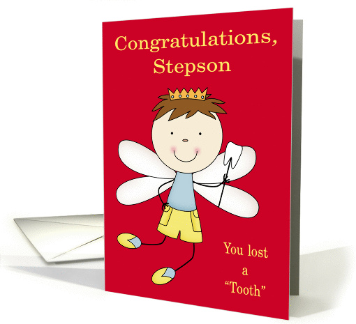 | Title: | Congratulations to Stepson, Losing tooth, boy fairy, crown on red |