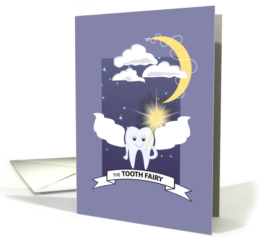 | Artist Notes: | Illustrated Congratulations card for loosing a tooth. Flying fairy that is a tooth holding a wand in a night sky. Crescent moon wrapped in dental floss surrounded by puffy clouds and stars. Banner below reads "The Tooth Fairy". |
