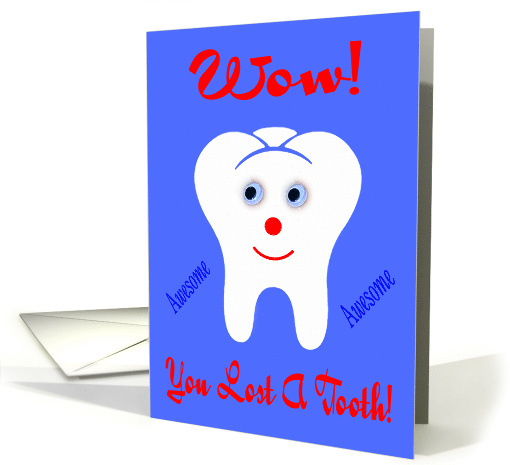 | Artist Notes: | Congratulate someone on a losing of a tooth with a cute google eyed tooth, smiling. The background is a pretty blue with red and blue text. |