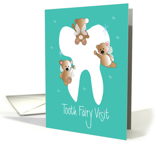 | Artist Notes: | "Tooth Fairy Visit" is the white hand lettered wording, at the bottom of this bright teal congratulations card for a child who has just lost a tooth. Above, on the card, a huge white tooth has three little bear fairies hoovering around it, flapping their fairy wings. The tooth has twinkles, with tiny soft hearts filling the teal background. The inside wording of the card says "You've lost a tooth! Congratulations!" |