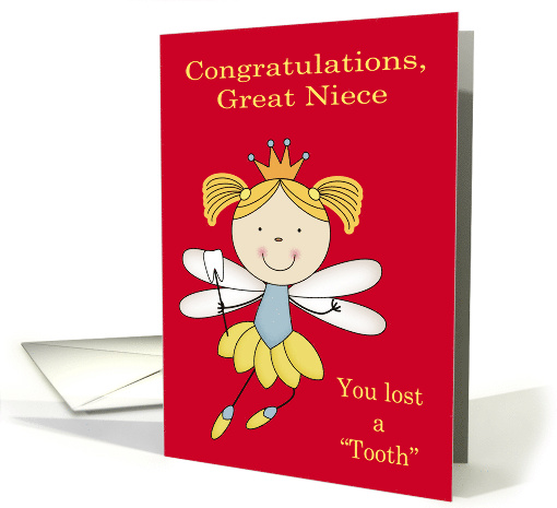 FYI: Celebrating a lost tooth is a longstanding universal tradition. Even the Vikings prized baby teeth. Compared to the two other main figures in modern American mythology, the Tooth Fairy is the new kid on the block. Congratulate your great niece on losing a tooth with a card featuring an adorable girl fairy wearing a crown with wings and holding a tooth wand. The background is red with yellow text. Original design by Laurie Schneider, elements by Arda Designs . FYI: Celebrating a lost tooth is a longstanding universal tradition. Even the Vikings prized baby teeth