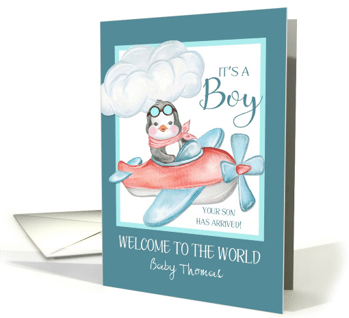| Artist Notes: | It's a Boy", "Welcome to the World" congratulations card to parents on the birth of their son has an adorable penguin flying an airplane. Customize with the new little boy's name. |