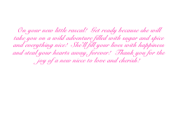 On your new little rascal! Get ready because she will take you on a wild adventure filled with sugar and spice and everything nice! She'll fill your lives with happiness and steal your hearts away, forever! Thank you for the joy of a new niece to love and cherish!