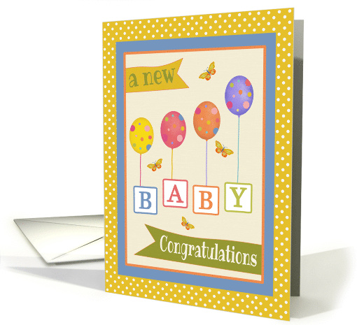 This is a Congratulations on a new baby, boy or girl, with alphabet blocks, balloons with colorful dots and butterflies. The colors are gender neutral.