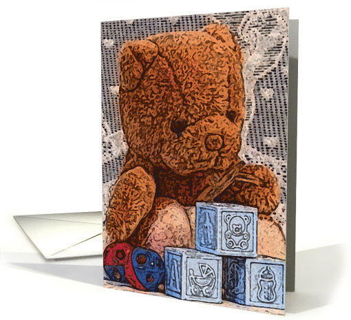 Illustrated toy bear with blocks. Toy blocks have illustrations of a baby bear, buggy, and a bottle. Appropriate for new baby congratulations.