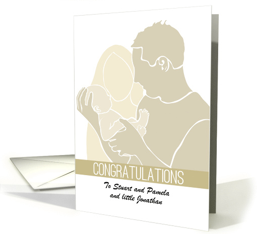 Congratulations on arrival of your baby. This brown and beige color block sketch shows the outlines of dad, mom and the little one. Dad is holding baby with mom looking on. This design is customizable for dad, mom and baby's names.