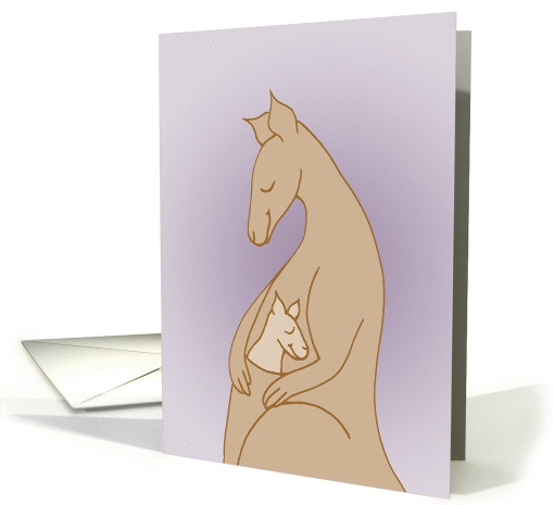 This illustration features a mommy kangaroo and her sweet baby on a soft lavender background. It is a perfect choice to congratulate the arrival of a new baby.