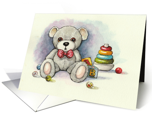 The front of this card features a digital reproduction of a watercolor painting depicting a teddy bear surrounded by marbles, blocks, and a stacking toy. Inside, there is a little verse, but, as always, this part of the card may be edited if desired.
