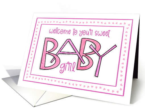 Pink wonky letters spell out the word "baby" and look stacked due a digitally created stippled shadow effect. A border of pink hearts is the finishing touch.