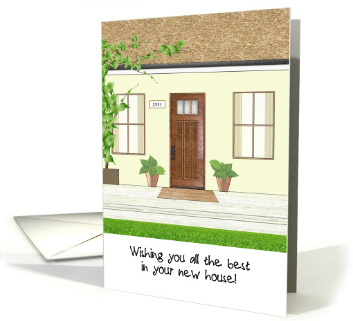 | Artist Notes: | Congratulations on your new house. Pretty facade showing wooden front door and windows on either side. Pot plants stand on either side of the door. A healthy climbing plant has reached the roof. This design is customizable for the house number which is written on a plaque beside the door. |