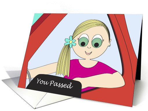 | Artist Notes: | A Bright New Driver card for a Special Someone. This card shows a young woman leaning out of a red car window, with a 'You Passed' Message on the mirror. |