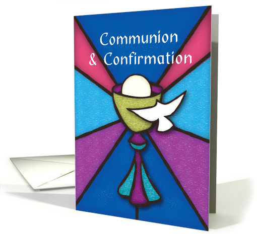 | Artist Notes: | Stained glass look adds depth and warmth to the chalice, host and dove. Wish blessings as you congratulate someone on their RCIA sacraments of Confirmation and Communion. |