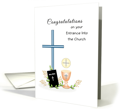 | Artist Notes: | Congratulations on your Entrance into the Church greeting card, with illustration of a cross, bible, chalice, communion wafer, leaves and brown stems. Inner verse is customizable during the checkout process. Image copyright Sheryl Kasper |