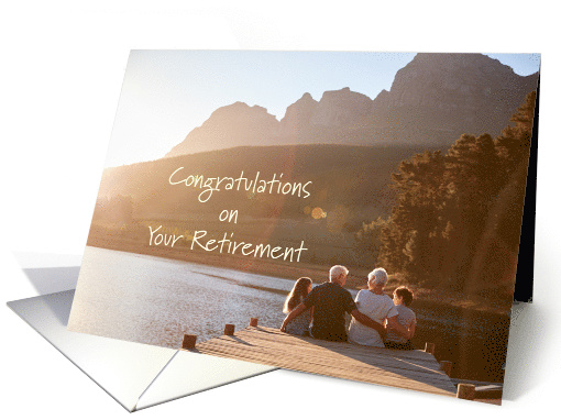 Congratulate someone on their retirement with this card featuring a photo of couple and two children sitting on the end of a dock facing mountains, trees and a lake at the sunset of a day.