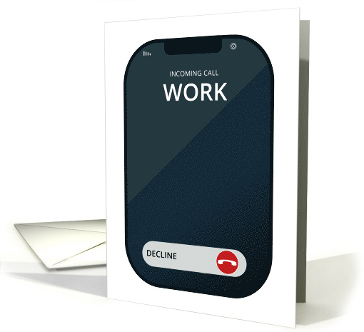 Illustrated humorous retirement card for anyone. A generic cell phone screen showing the user interface for declining an incoming work call. Connectivity and energy bars are visible near the top of the screen.