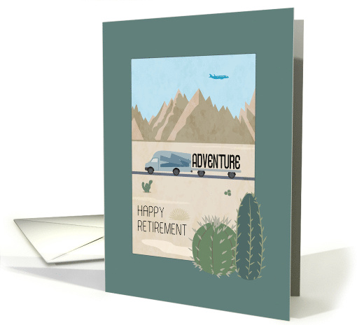 Illustrated Happy Retirement card. A recreational vehicle towing a trailer on a desert road. The RV is carrying the word "adventure" on a trailer. A pair cacti is in the foreground. Grand mountains and an airplane in the background. Happy Retirement is on the front. Inside text: Next stop, Adventure. Happy Retirement