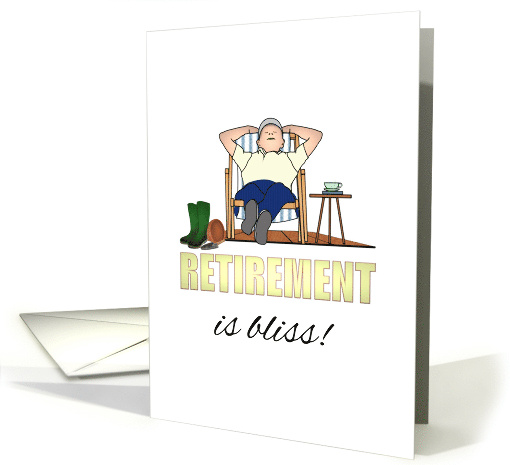 Retirement, ah, bliss! This fun illustration shows a man relaxing in a deckchair. He is dressed casually and with a cap. On the side table is a cup of tea resting on a book. On the ground is a pair of gardening boots, a plant pot and a trowel.