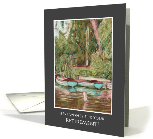 | Artist Notes: | A Retirement Best Wishes card, with two small blue rowing boats moored up at the side of a lake, from a soft pastel painting by Judy Adamson. There is a dark brown border around the painting and the words, 'Best wishes for your RETIREMENT!' are in white lettering on the border. Please feel free to change or delete the inside message if you wish. |