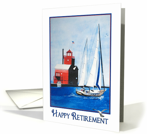 | Title: | Retirement watercolor red lighthouse and sailboat in harbor |