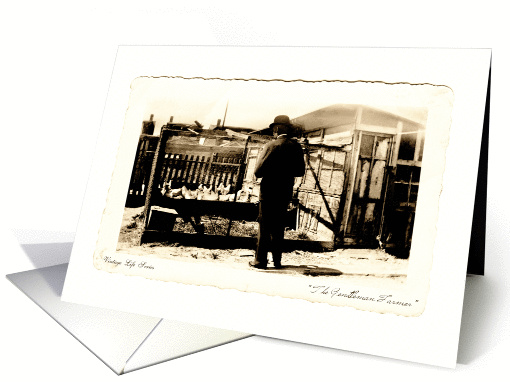 Retirement card featuring an old gentleman contemplating his city chicken coop. A vintage scene from old Scotland.