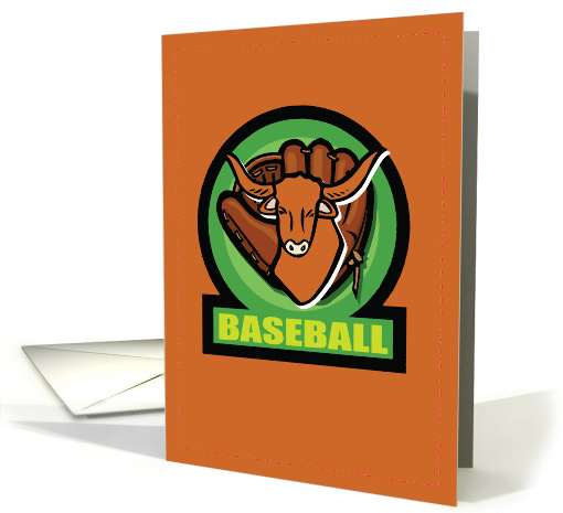 Three cheers for someone special who really loves baseball. Surprise them with this orange, brown, yellow and green illustration of a longhorn and a baseball glove.