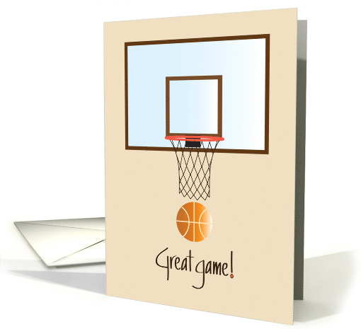 | Artist Notes: | This hoop and basket card is a fun way to congratulate your favorite basketball player for the great game they just played or the entire basketball team for their victory. The card's basketball is falling through a woven basketball hoop below the glass basketball backboard, above the brown hand lettered wording "Great game!" The card's inside wording says "Congratulations!" |