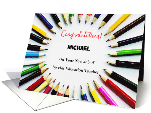 | Artist Notes: | Give this custom name congratulations card to that hard working special education teacher who has earned a new job. The cover features colored pencils on a white background, pointing to the center where the headlines are. The persona name is placed under the red 'Congratulations.' You may change the inside message, if you wish. ©Gail Pepin |