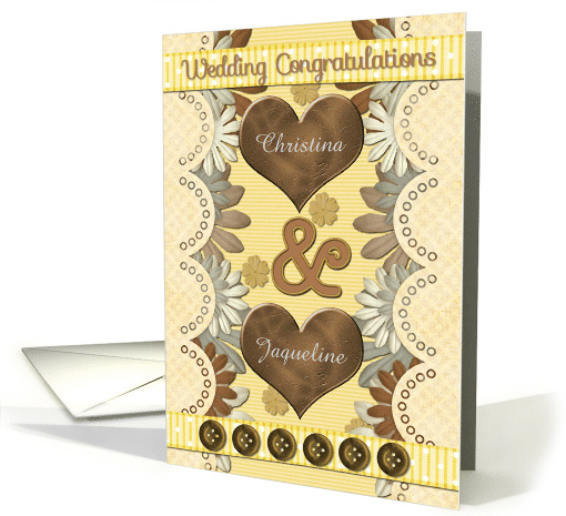 | Artist Notes: | Offer wedding congratulations to a lesbian couple with this scrapbook style card that features brown hearts, flowers, bright yellow ribbons and brown buttons.You personalize with the brides' names.Original design by Betsy Bush for Dragonfire Graphics.Design elements by pixelscrapper.c |