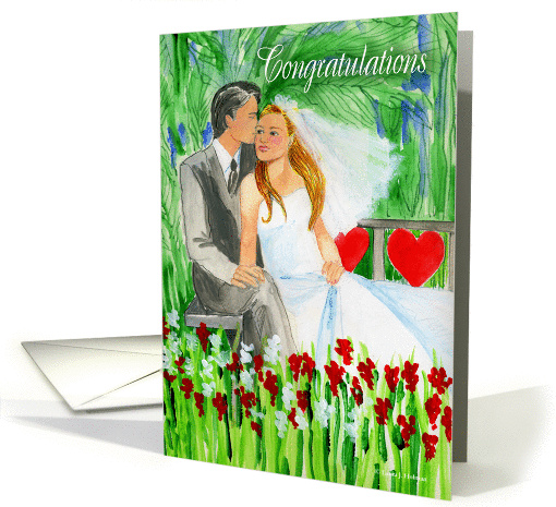 Beautiful bride in white gown and handsome groom in tux sit amongst lush green tropical plants and white and red flowers. Red hearts adorn the back of the bench they sit on. Original watercolor art by independent artist © Laura J. Holman 2012.