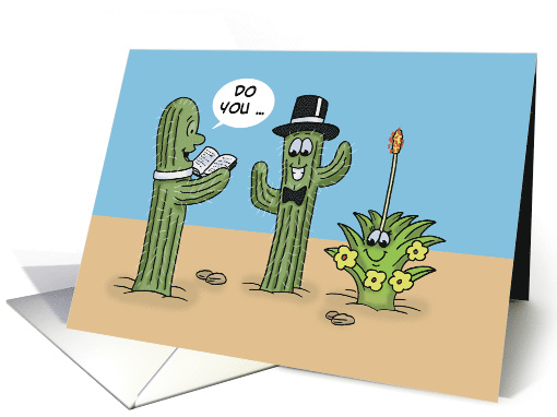 Cute wedding/marriage congratulations card for. Instead of people, the minister, the groom and the bride are all cactus/succulents. Inside says, Congratulations, May you both have many happy years together!