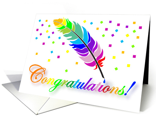 A colorful feather pen writes out a congratulations for a couple on their marriage.
