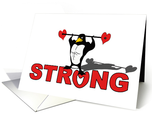 Your Love is Strong. Cute congratulations on your wedding greeting card. A penguin with abs and muscles is lifting heart shaped weights. Muscle penguin courtesy hgomez/openclipart.