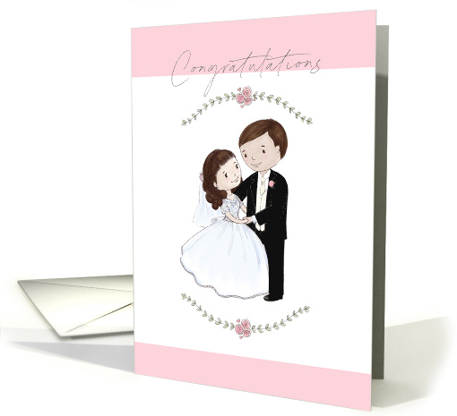 Illustration of a bride in a full-skirted wedding gown with lace details and a groom in a black tuxedo with cream tie and vest. Pink roses, hearts, and leaves add a decorative flourish at the top and bottom of the card. Pink edging on the top and bottom. The word "Congratulations" is written above the couple. Artwork by children's book illustrator, Lisa M. Griffin.