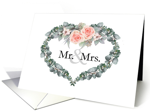 Newly married couples love to have people say Mr. and Mrs. after the wedding. This design says it starting in this design heart. The heart wreath is filled with eucalyptus and peach coral roses with tiny white flowers on top made to look like a watercolor design.