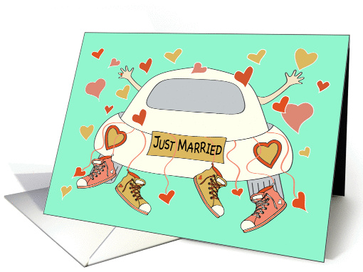 Inspiration for this card came from thinking about old, sometimes forgotten traditions. This card is a modern take on the old tradition of fastening boots the bumper of the Wedding Car.