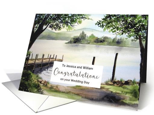 Delight someone special with this exquisite greeting card showcasing a watercolor painting by myself, Farida Greenfield. The artwork captures the breathtaking scenery of Derwenwater Lake near Keswick in the Lake District North of England during a peaceful summer day. The tranquil view of the lake, misty hills, and lush green trees creates a calming and inviting atmosphere, making it a perfect card to send warm thoughts and well wishes. The card design is for Jessica and William on Wedding Day and can be customized for any names.